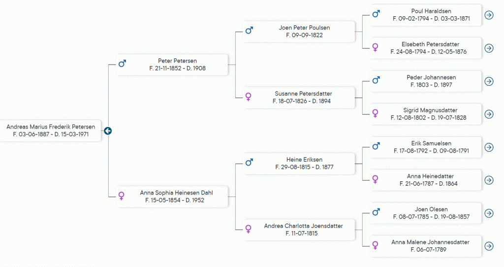 Andreas Marius Frederik Petersen føddur 4. juni 1887 í Oyndarfirði, doyði í 1971 í Oyndarfirði, har hann er grivin.