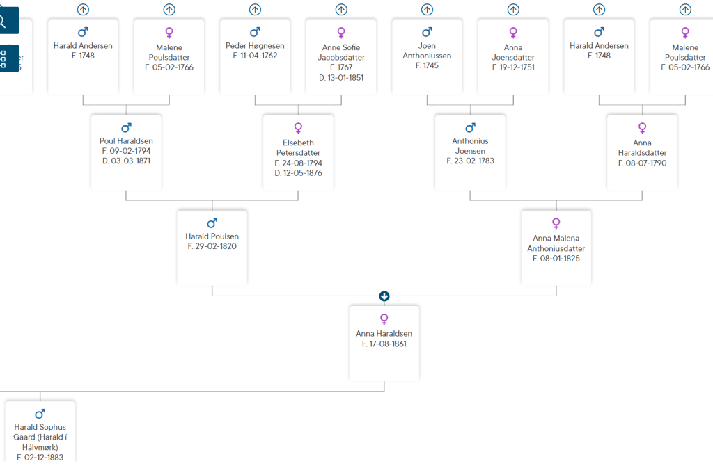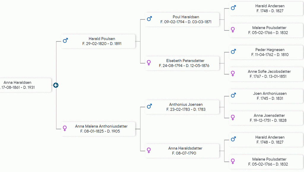 Anna Haraldsdatter var dóttir Malenu Poulsdatter 1766 – 1832 og giftist hon 19. novembur 1789 við Haraldi Andersen 1748 – 1827 úr Vík.