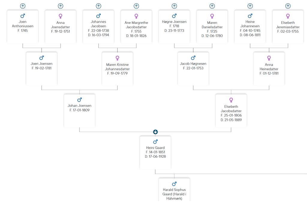 Heini Gaard f. 1851 og d. 1928 kom úr Garðshorni og bygdi húsini í Hálvmørk, tá hann giftist við bóndadóttrini Anna Haraldsen f. 1861 og d. 1932 í Tarti. Heini var timburmaður, tí hevur hann sjálvur smíðað gomlu Hálvmørk.